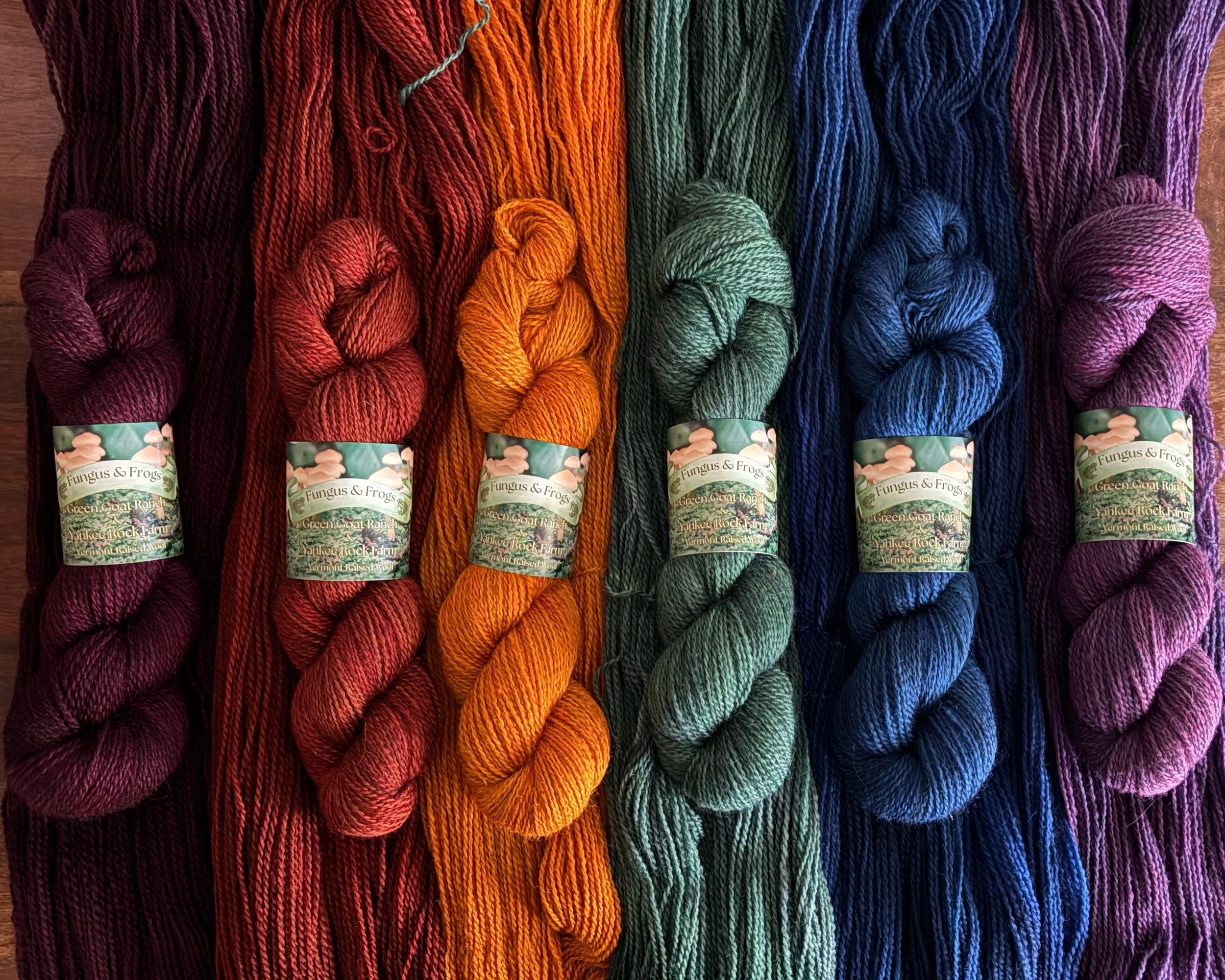From twilight blues to fungal lilacs, sunny frog bellies to moss-dark shadows, Fungus and Frogs invites you to stitch a little wild into your making. Local wool, dyed with care, full of depth, and spun from the heart of your biome.